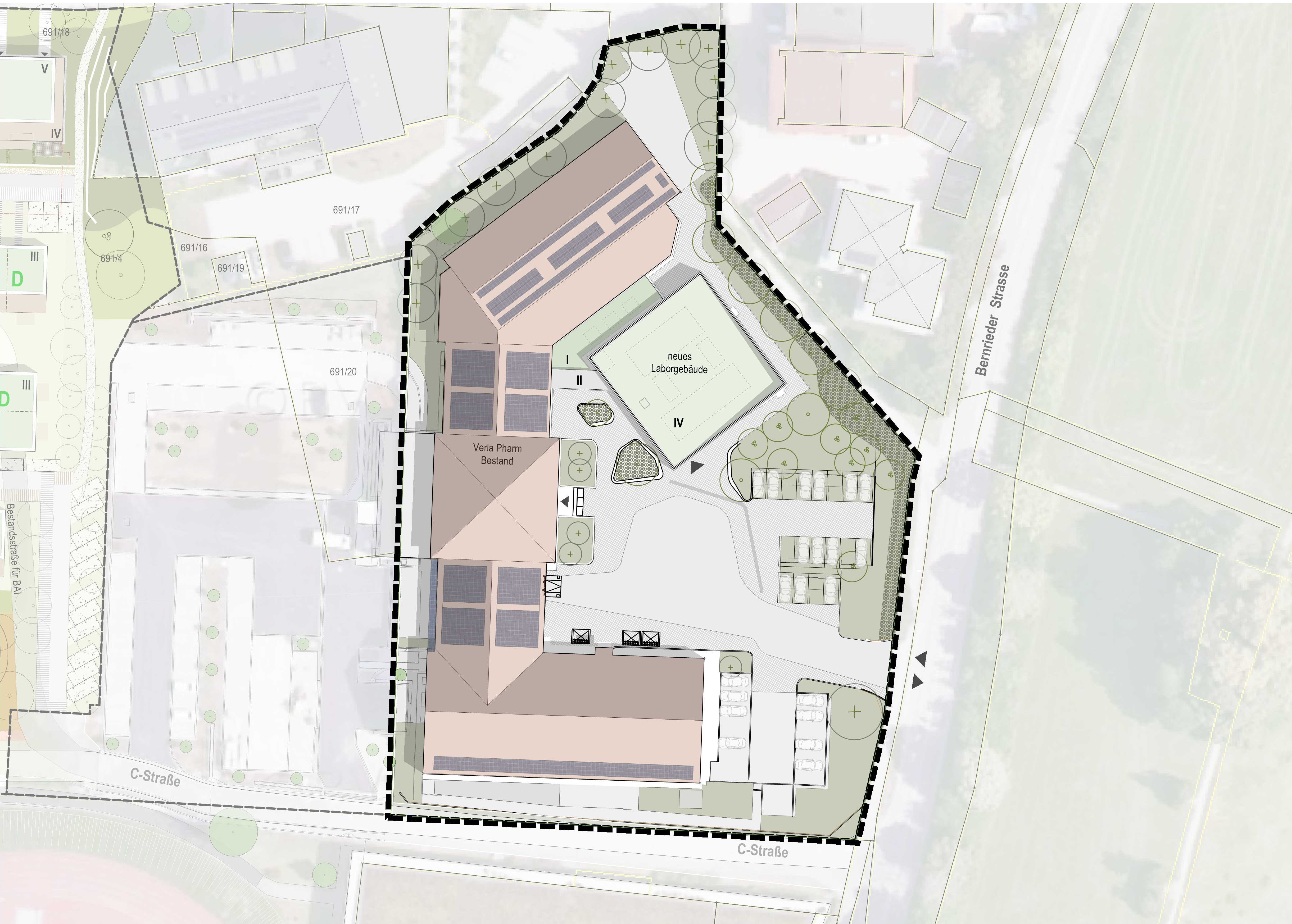 Im Süden von Tutzing entsteht neben dem bestehenden Betriebsgebäude der Verla-Pharm ein neues Labor- und Bürogebäude. Der Neubau schließt im Erdgeschoss und über einen Steg an das bestehende Betriebsgebäude an und wird auf einer bisher als Parkplatz genutzten Fläche errichtet. Hier finden auf zwei Geschossen neue Arbeitsplätze, sowie neue Laborräumen auf weiteren zwei Geschossen platz.